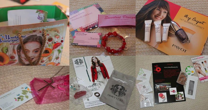 Klik op de collage om alles wat groter en duidelijker te zien. De armband komt van www.sweetestdesign.nl. Ik vind 'm schattig! De spulletjes van www.pupa.nl zijn ook al zo leuk. Ik was meteen verliefd op het lakje en ga 'm binnenkort zeker proberen. Ook zat er in de goodiebag een kruisketting van www.sieradenkistje.nl. Wat is die gaaf! Ik vind Sieradenkistje een erg leuke webshop en had er eerder ook een moustache ketting van. Heel leuk dus. De oorbelletjes (die erg leuk waren verpakt) zijn van www.odetti.nl. Dan de testers in zakje: www.time4beauty.be. En de handcrème: www.rebrocosmetics.nl. Niet te vergeten de vele maskertjes van www.montagnejeunesse.com, echt zo leuk om zoveel maskertjes te krijgen! Ook de goodiebag zelf was van Montagne Jeunesse. Yes, ik ben hier allemaal erg blij mee! Leuk, hè? En wat vinden jullie van de foto's van de bloggersmeeting?
